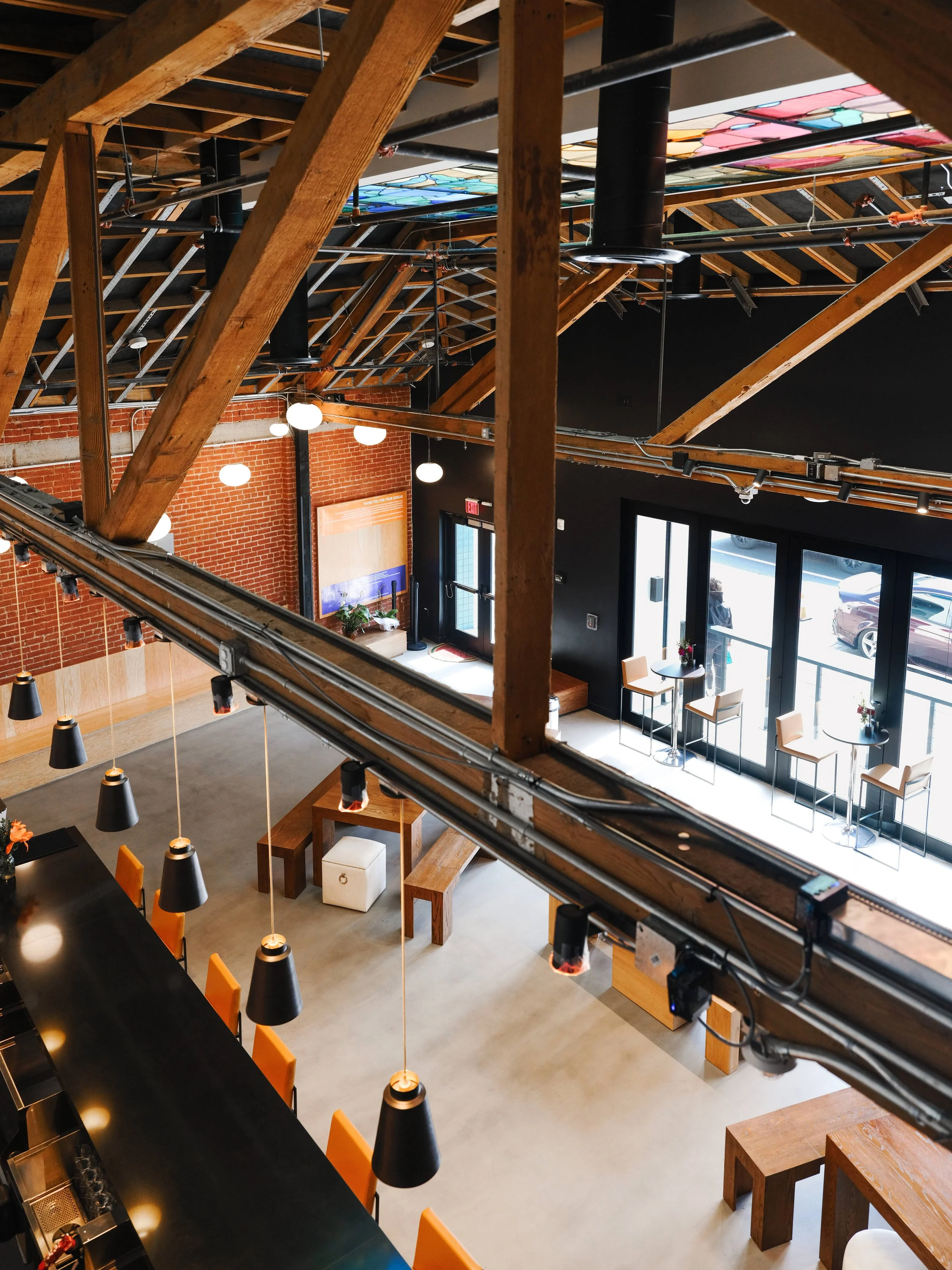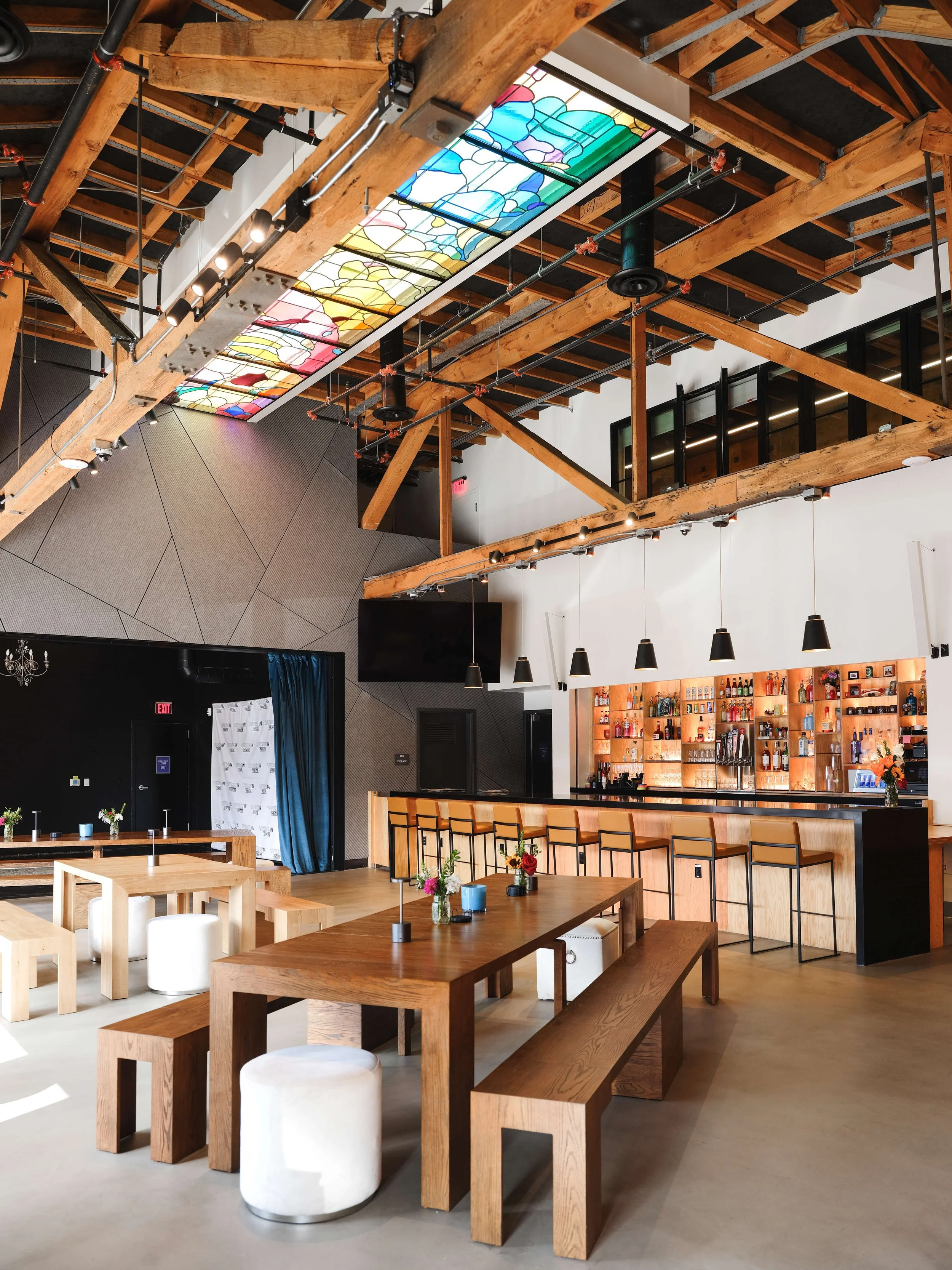 The skylight overhead features a stained glass piece that pays tribute to the artistic legend Mike Kelly who studio this once was, and that was fabricated by Judson Studios, a local stained glass fabricator founded in 1897.