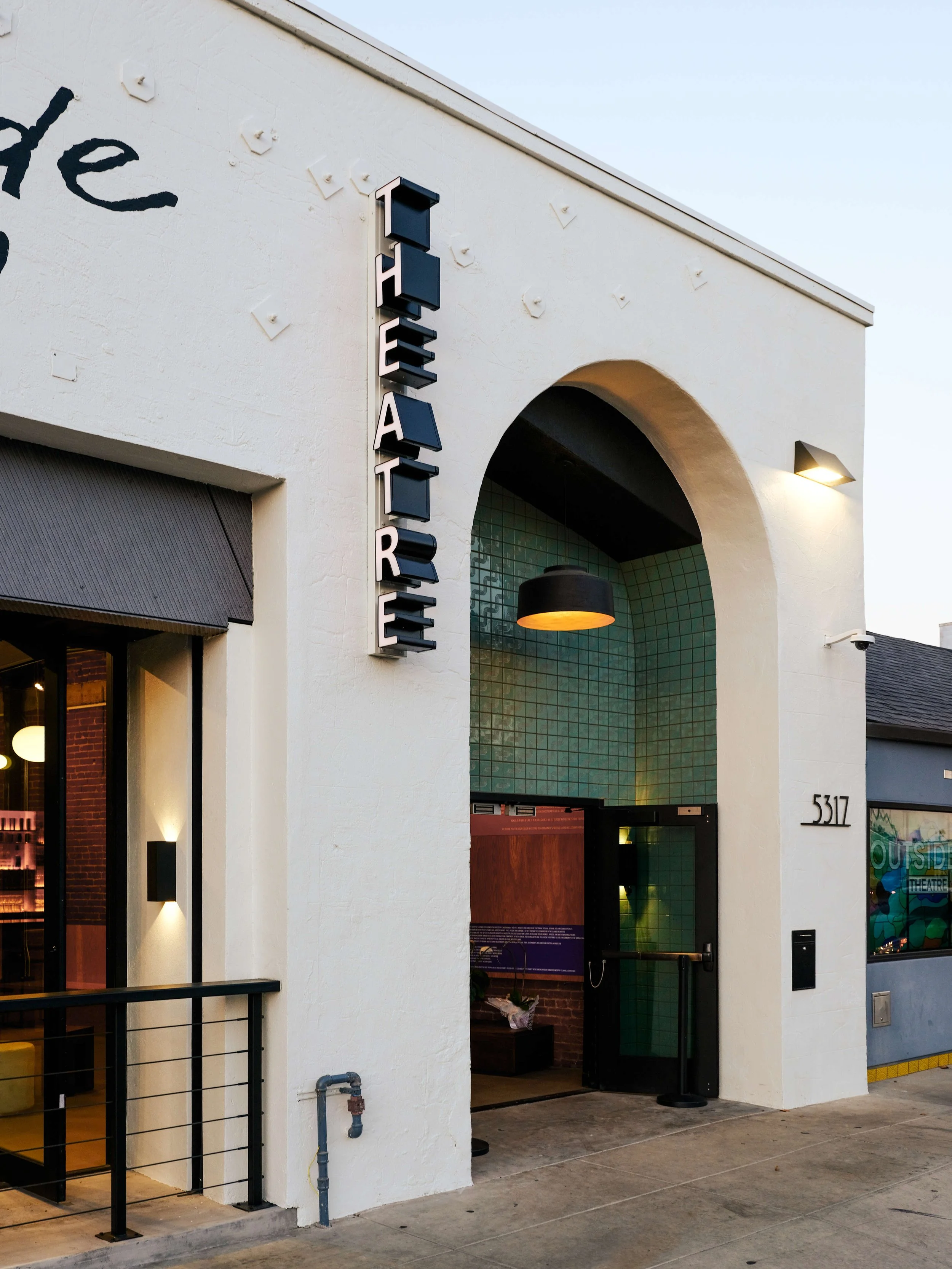 A series of glowing pendants flicker at show time to lead the audience from the community space past the ticket booth into the theater itself.